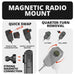 Made from billet aluminum, this CB radio mic holder is both simple and stylish. It's equipped with a 20mm ball that connects via our Type-B Connection. If needed, you can replace this ball with a 25.4mm, 26mm, or 17mm ball to fit other ball and socket systems. Additionally, the holder has a unique two-part design. It comes with a custom attachment to replace the clip on the back of your Midland radio. This transforms it into a robust magnetic mounting system. With 8 neodymium magnets (4 on each side) and matching polarities, you can easily detach the radio from the mount with just a quarter-turn. (Compatible with Midland MXT275 and Midland MXT575)