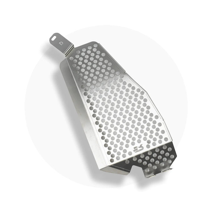 Cali Raised LED's Catalytic Converter Shield is laser cut and CNC bent, made with American 12Gauge 304 brushed Stainless Steel. This product is one of the best ways to protect your catalytic converter. Our circular hole design on the product provides ample heat dissipation while maintaining high quality.