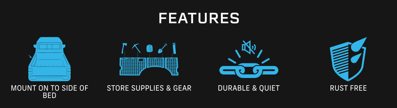 Crafted from high-quality steel, these panels offer efficient cargo storage opportunities while leaving the main cargo space in your bed free for larger items. Now you can bring along all your essential tools, such as a shovel, hi-lift jack, fluid tanks, recovery gear, and more. To ensure durability and long-lasting performance, our panels have been finished in a hammer black powder coat. Once installed, the panels remain rigid and secure, yet are easily removable if needed. This protective coating not only adds a sleek and rugged look to your truck but also guards against rust and harsh weather conditions. Made in the USA, these panels are built to withstand the demands of any adventure you embark on.